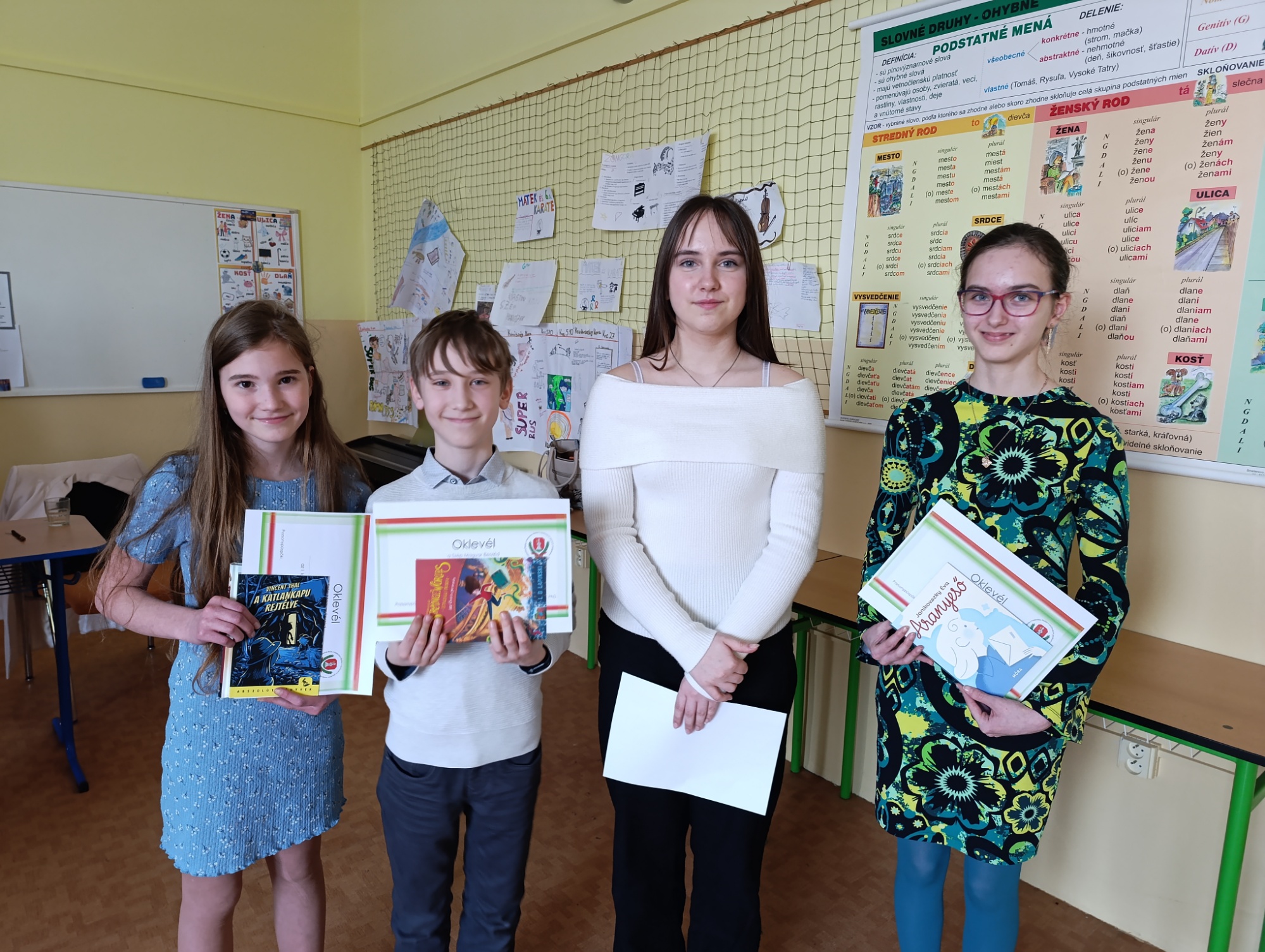A kerületi szavalóversenyen iskolánk hat tanulója jutott tovább az országos döntőbe: Mózes Márton próza 1.kategória, Šípoš Kevin vers 2.kategória, Sándor Anna és Šillo Mária próza 2. kategória, a 3. kategóriában pedig Turcsányi Cynthia vers, Bertok Natália pedig próza kategóriában. Mindannyiuknak sok sikert kívánunk az országos döntőhöz, valamint gratulálunk az összes többi versenyzőnek, akik csodálatos ezüst sávos besorolást nyertek!
